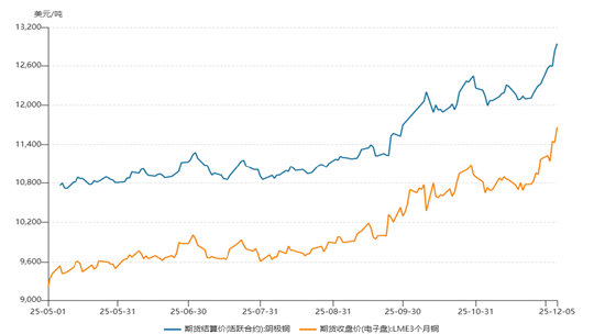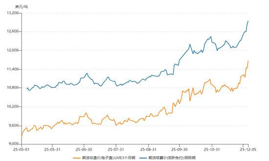 2025年12月初,全球铜价迎来爆发式上涨。12月8日,LME铜价格盘中一度触及11771美元/吨的历史峰值,沪铜价格突破90000元/吨大关,沪铜主力合约收盘92970元/吨,创历史新高,日内最高达93300元/吨。