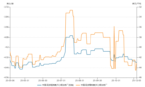 这一自律性减产措施,旨在改善铜精矿供需基本面,但从短期来看,直接导致市场对未来精炼铜供应的预期大幅收紧。与此同时,当前正处于2026年铜精矿加工/精炼费(TC/RC)的谈判期,谈判进展艰难,加工费面临持续下降的压力,这一现象背后正是铜矿供应偏紧的直接体现,也使得冶炼企业的生产积极性受到抑制,矿端与冶炼端的供需矛盾进一步凸显,为12月铜价的暴涨埋下伏笔。